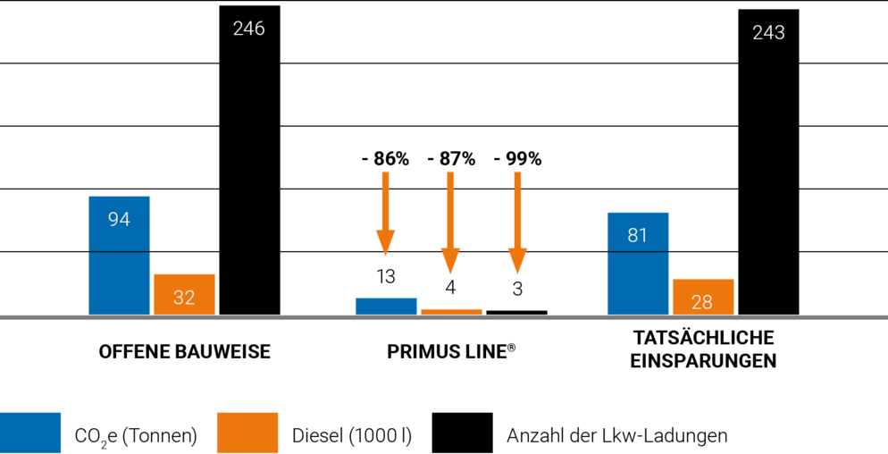 Bei dieser Analyse ergab sich eine signifikante Reduzierung der Kohlenstoffemissionen um ca. 86 %. Zurückzuführen sind diese Einsparungen auf deutlich weniger nötige Lkw-Ladungen (minus 99 %) und einen erheblich niedrigeren Kraftstoffverbrauch (minus 87 %) für den Einsatz von Baumaschinen, z. B. zum Ausheben von Baugruben.