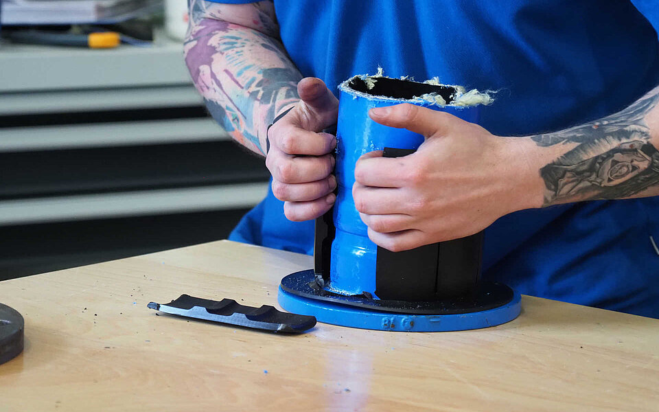 Die M-Verbinder von Primus Line bestehen aus einem Pressring, einer Formhülse und einem Kern. Durch rein mechanische Kräfte entsteht zwischen dem Liner und dem Verbinder eine zugfeste Verbindung. Dies wird durch das Einpressen des Kerns in die Hülse mithilfe von hydraulischem Werkzeug erreicht.